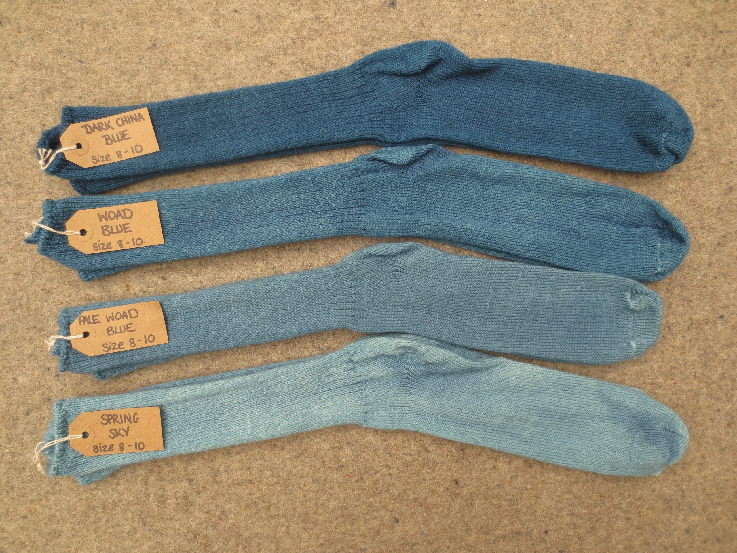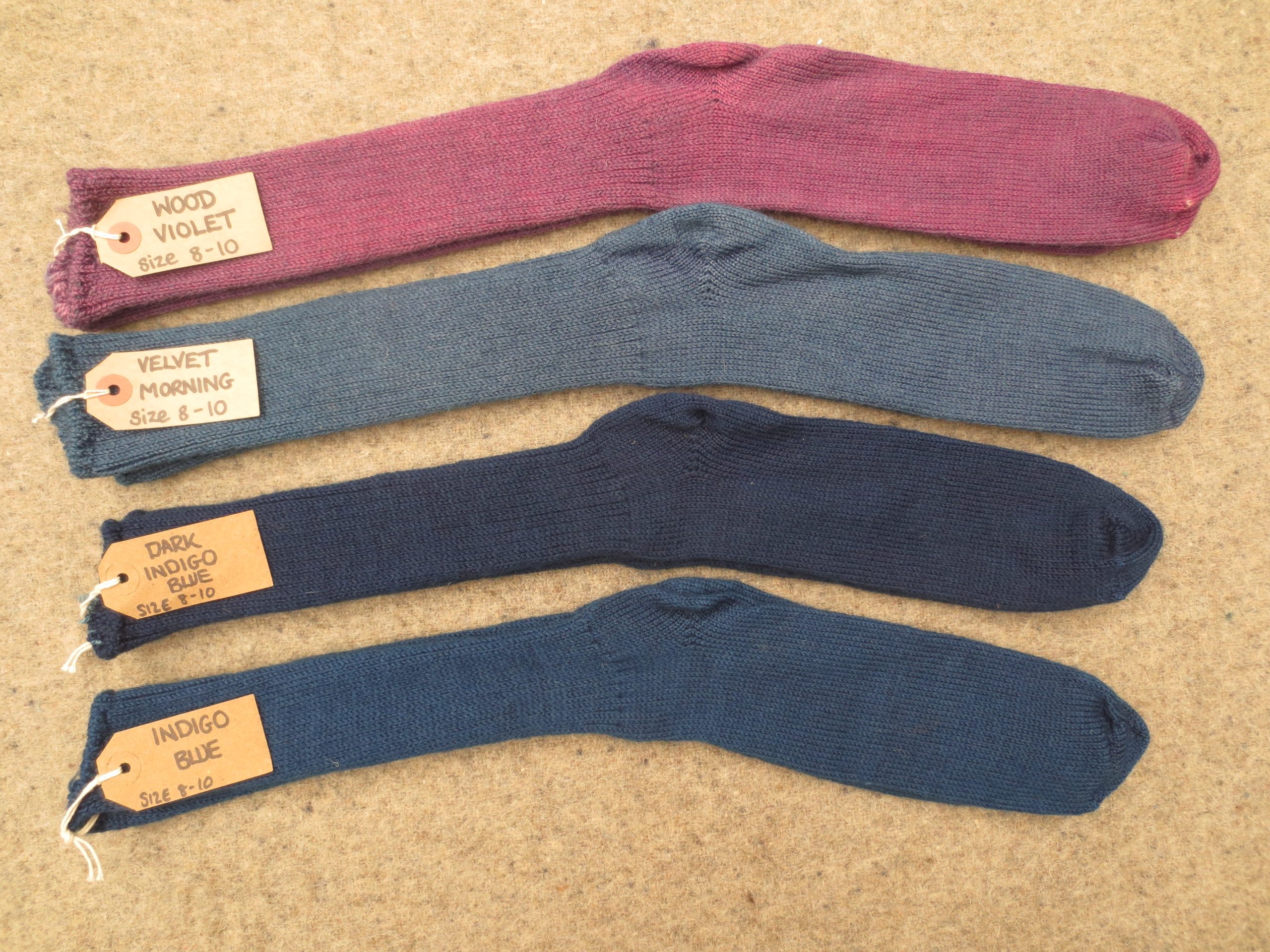 The socks are knitted by a traditional, family run sock manufacturer in the UK Midlands.  The yarn from which they are knitted is spun and by John Arbon at the Fibre Harvest mill in North Devon. They are then dyed by us at our small outside dye house in Oxfordshire, using well water and plant dyes, many of which are grown or gathered by us in a sustainable way from the organic Estate on which we are based. When we do use imported dyes we source these directly, or from a company with a strong ethical sourcing policy.